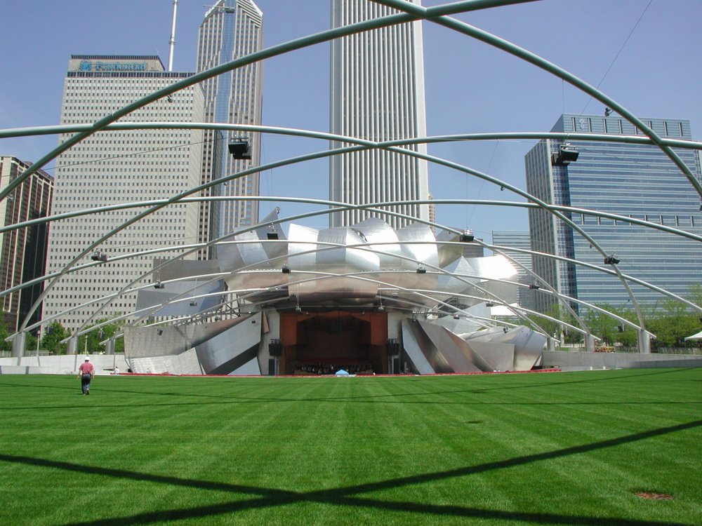 Jay Pritzker Pavillion – pavilon byl navržen renomovaným architektem Frankem Gehrym a jedná se o 36,6 m vysokou konstrukci z ocelových obručí, která se klene nad parkem jako kovová koruna.