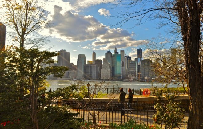 V pozdních odpoledních hodinách se vydejte metrem č. 4, 5 nebo 6 z Union Square na zastávku Brooklyn Bridge/City Hall a přejděte přes most Brooklyn Bridge, který je jedním z velkých divů New Yorku už od svého dokončení v roce 1883. Pokud se nemůžete nabažit úžasných pohledů na panorama Manhattanu zářící za soumraku, budete ho moct pozorovat při večeři v River Cafe, podniku, který se nachází přímo u vody pod mohutným mostem. Anebo můžete vyzkoušet některou jinou a méně drahou místní restauraci, jako je Grimaldi's (s pizzou) nebo Bubby's (s burgery a smaženým kuřetem).