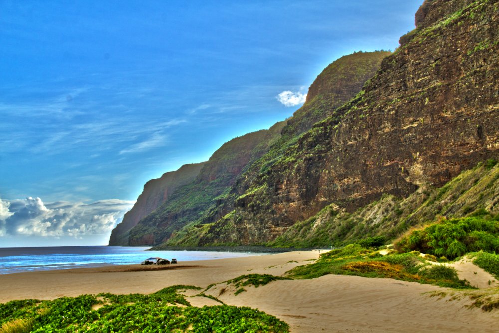 Scenérie připomínající konec světa je charakteristická pro pláž ve Státním parku Polihale. Je to nejzápadnější bod ostrova Kauai, kde slunce zapadá nad bílou písčitou pláží o délce více jak 11 km s prehistorickými útesy v pozadí. I přes bičující vítr a vodu, která je obvykle příliš neklidná na plavání, stojí za to podniknout zajížďku na tuto pláž, kde se budete moct projít u okraje moře. Upozorňujeme však, že nezpevněná přístupová cesta do parku bude nejspíš vyžadovat terénní vozidlo 4WD.