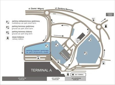 Varšavské letiště Chopin vám nabízí 3 700 parkovacích míst na čtyřech parkovištích. Parkování přímo před Terminálem je zakázáno kromě krátkého „mezipřistání“ :-), např: během vyložení zavazadel z auta.